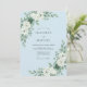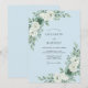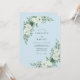 Denna design har en lugnande himmelblå bakgrund dekorerad med eleganta botaniska arrangemang. Frodiga vita rosor är parade med dammigt grön eukalyptus och strukturerade suckulentaccent för en lugn, organisk estetik. Den svaltonade paletten skapar en sofistikerad atmosfär lämplig för en säsongsbetonad vinter- eller vårhögtid.