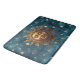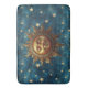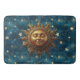 Mitt i en stjärnig himmelsbakgrund, den lugna framsidan av en stiliserad gyllene sol.