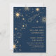 Tillsätt en touch av kosmisk elegans till din fest med vår himmelsblå bröllopsinbjudan. Fördjupa dig i den förtrollande enkelheten i vår design, som speglar den hypnotiska magin hos himlakroppar. Vår trendiga men tidlösa design visar solar, månar, stjärnor och en planet konstnärligt renderade i guld på en slående marinblå bakgrund. Denna touch av guld tillför en antydan om värme och gnistrande charm till den svala midnattsblå basen, vilket ytterligare förstärker den inbjudande lockelsen hos stycket. Designen håller en minimalistisk approach, vilket låter de himmelska elementen verkligen lysa. Du kan enkelt anpassa den för att passa dina behov, vilket säkerställer att varje stycke ekar din unika stil.
