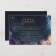 Komplettera din himmelska bröllopssvit med det Celestial Waters Midnight Blue Detaljeringskort. Designat för att matcha den matchande inbjudan, har detta kort en djup midnattsblå bakgrund prydd med digitala guldtonade accenter (observera: inte riktig folie), som frammanar den drömlika atmosfären under en stjärnklar himmel.