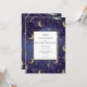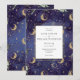 En vacker himmelskt bröllopsinbjudan med guld, månar och stjärnor på en midnattsblå bakgrund och modern elegant typografi. Designad av Thisisnotme