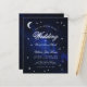 En budgetbröllopsinbjudan med ett himmelskt bröllopstema, med månen och stjärnan på en stjärnklar blå bakgrund. Orden Wedding och namnen är skrivna med en elegant kalligrafisk skrift. Månen och ordet Wedding är falsk silverfolie, resten av texten är vit. På den svarta finns bara månen och stjärnan på en stjärnklar blå bakgrund.