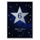 Ett bröllopsbordnummer för ett himmelskt bröllopstema, med silverfärgade stjärnor på en mörkblå natthimmel bakgrund.