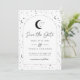 Ett himmelskt mån- och stjärntema för en spara-datum-kort i en monokrom färgpalett. Anpassa färgen på stjärnmönstret, bakgrunden, valvets fyllning och månens element!