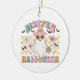 Cute, färglös, roligt Hippie Halloween-keramiskt prydnadsämne har ett hippie-spöke med rosa häxhatt, text som lyder Hippie Halloween och blommor och lite fladdermus och döskallar i lavender, melon, aqua och rosa!