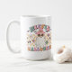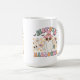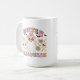 Roligten Hippie Halloween mugg har ett hepie-spöke med rosa häxhatt, text som lyder Hippie Halloween och blommor och små fladdermus och döskallar i lavender, melon, aqua och rosa!