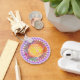 Tryckfärgad regnbågssolrosa med kaleidoskoppetaler i en lila cirkel. Hippie, trippy, lycklig!