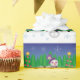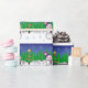 Den gulliga hippiesnögubben som ha på sig en purpurfärgad hatt, scarf och solglasögon med fredsteckenblomman, knäppas, och en smiley faceblomma på den är hatten. Bak snögubben är en vinterplats med julgranar, snö och en blå himmel med snöflingor.