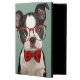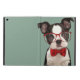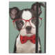 Gullig illustration av en valp för hipsterstilboston terrier som ha på sig ögaexponeringsglas och den chic röda flugan på blåttbakgrund. Designat vid Maryline Cazenave.