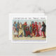 Färgbildens kostymer i Mitten visar nio människor i olika historiska kostymer från 1100-talet till 1500-talet, med en förklaring av var och en vid grund.