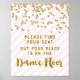 Var snäll och hitta er plats, men ställe är på dansskylten golv bröllop poster i lätt pastelliserad rosa och vit rand mönster med guld konetti och handskriven stil-skrift.