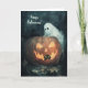 Happy halloween hälsning med en underbar roligt Halloween-scen med en svart katt och ett spöke som söker efter en annan svart katt inuti en Jack o lantern-pumpa