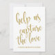 En elegant, modern bröllopsskyllt med texten "Hjälp oss fånga kärleken" i ett utåtriktat script-teckensnitt, den glittriga texturen ger en festlig och glamourös touch. Bakgrundsfärgen kan anpassas enligt dina behov och önskemål, vänligen kontakta mig om du har några speciella önskemål.