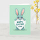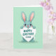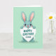 Det här kortet visar en vänlig kanin med långa öron, stora uttrycksfulla ögon och mjuk teal päls, stående centrerad mot en pastell mintgrön bakgrund 🐰. Kaninen håller upp en hjärtformad skylt ovanför huvudet som om den erbjuder den till någon speciell, med ett ömt, ivrigt leende och rosiga kinder som antyder en söt förälskelse eller nära vänskap. Greeting-texten sitter på hjärtat i djup teal färg, med ett par små kärlekssymboler placerade i närheten. En mjuk rosa nyans kantar de höga inre öronen, ramar in ansiktet och ger ett mjukt, tillgiven uttryck. Layouten är enkel med gott om tomrum, vilket håller fokus på karaktären och budskapet. Färgerna känns lätta och
