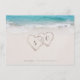 Innehåller romantisk turkos vatten och vit sandstrand, och två hjärtan i sanden med brudens och brudgummens initialer på baksidan, bra boendekort för sommarstrandbröllop eller tropiskt destinationsbröllop.