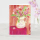 Detta fantasifulla hjärtbukettkort är en vacker överraskning i brevlådan. Bilden är en flerfärgad akvarellmålning av en kanna överfull med hjärtblommor, ett rött dukklätt bord, hjärtväggpapper och en hjärtformad trästol. Inuti: Tom RECENSION: "Så vackert kort. Färgerna är så fantastiska."