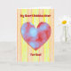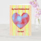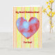 Originalkonst med mitt grafiska hjärta som är en sammanslagning av bokeh-bubblor i röda och blå färger stiliserade till en hjärtsiluett. Hjärtat är placerat på ett slitstarkt, något bleknat vintage-randigt mönster i liknande färger för ett konstnärligt utseende. På utsidan av kortet står "Mitt hjärta bubblar över för dig!" och på insidan står "Din kärlek får mitt liv att brista av glädje!". Detta kort kan vara ett Alla hjärtans dag-kort eller bara ett kort för att uttrycka din passionerade kärlek till någon!