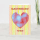 Original konstverk med mitt grafiska hjärta som är en sammanslagning av bokeh-bubblor i röda och blå färger stiliserade till en hjärtsiluett. Hjärtat är placerat på ett slitstarkt, något bleknat vintage-randigt mönster i liknande färger för ett konstnärligt utseende. På utsidan av kortet står "Mitt hjärta bubblar över för dig!" och på insidan står "Din kärlek får mitt liv att brista av glädje!". Detta kort kan vara ett Alla hjärtans dag-kort eller bara ett kort för att uttrycka din passionerade kärlek till någon!