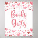 Den rosa hjärtdagsbok och present baby shower skylten visar en rolig aktivitet där gästerna uppmanas att bidra med varma böcker och genomtänkta presenter till den lilla. Det är ett charmigt sätt att skapa en skattkista av kärleksfulla berättelser och omtyckta presenter för att välkomna barnet till världen.