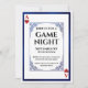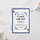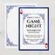 Denna spelkvälls inbjudan har en klassisk design inspirerad av lekort. En utsmyckad, vintageinspirerad ram omger det centrala textområdet. En matchande blå foliedesign ramar in inbjudan. Två röda hjärtan och Ess-monogrammet är tryckta i motsatta hörn, likt layouten i en kortlek.