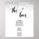 Föremål i denna kollektion har framträdande fraser renderade i en distinkt, elegant teckensnitt med hjärtan, tillsammans med en grafik som visar silverfärgat konfetti. I denna menytecken står det "the bar" med texten i ett elegant typsnitt. Använd mallfälten för att lägga till dina uppgifter och gör denna mottagningsskylt till din egen. // 80 //