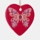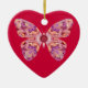 Detta presenterar den hjärtformade jul- eller mors dagprydnaden en härlig och ovanlig fjärilsdesign. Färgerna först marmoreras, då bildas in i en kaleidoscope och därefter in i en fjäril. Den marmoreras i steg, lavendel, guld och vit och är en en klockas slag verkställer mot en röd bakgrund.