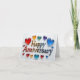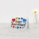 lycklig-årsjubileum med ord-firman "Lycklig-årsdagen" skriven i blankt, gyllene brev omgiven av färgstarka glashjärtan. Bakgrunden är ett helt vitt yta och texten är centrerad mitten i bilden. Texten är i form av ett hjärta och omges av små, färgstarka hjärtan från olika färg, inklusive rött, orange, gult, grönt, blått, lila och rött. Hjärtarna är placerade i ett symmetriskt mönster runt texten och skapar en visuellt tilltalande och festlig utformning. Den övergripande effekten är en glad och berömmande bild som förmedlar en känsla av lycka och firande.