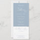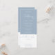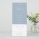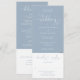 En allt-i-ett bröllopsinbjudan med elegant hjärtmanus typografi på en dammig blå bakgrund. Inbjudan inkluderar ett RSVP-kort som kan klippas av och detaljer om gästinformation. Designad av Thisisnotme