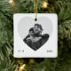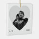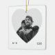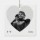 Ett modernt, vitt, fyrkantigt keramiskt prydnadsämne med ett stort, hjärtformat fotofönster. Ren mikrotext som skrivmaskin balanserar utformningen (initialer vid lämnat tidpunkt, år vid höger) medan monokroma ser ut som plattare för ett par foton. Redigera initialer och år om du vill markera förlovningar, årsdagar eller en favoritbild för helgdag - en elegant som är viktig för träd eller presentlådan.