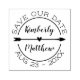 Romantic frimärke för att spara datumen med lycklig parets namn i kalligrafiskript för söt inuti en cirkel med en pil med ett hjärta i mitten. Spara vårt datum skrivs i en båge ovanför cirkeln och ditt bröllop-datum skrivs i en båge under den.