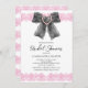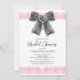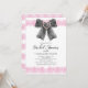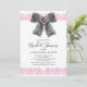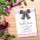 Modern och elegant bröllopsinbjudan med en akvarell svart coquettebåge med hjärtsnüre rosa bandkant och livfull kalligrafitext.