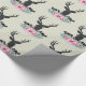Svällning papper med ett svart hjort med stora antenner. Geometriskt linjer i hjortens ansikte ger en kreativ beröring. Färgblommor och löv av mynta rosa bildar en söt blommigt bouquet under hans huvud. En skiss av bergsområden som är placerad bland blommorna ökar också känslan hos land.