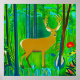 Poster i en stiliserad illustration av en hjort i en sagda skog, omgiven av träd och växter, i nyanser av brunt och grönt