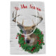 Stor buck-hjort i helgdag krans och röda bär på vit fågelbakgrund i träd. Text kan redigeras.