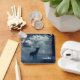 Nyckelkedja med ett foto av en regal hjort där antlers står i en skuggskog bland solbelyst träd. Snö faller hela vägen.