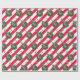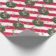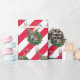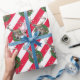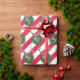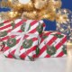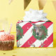 Stor buck-hjort i helgdag-andedräkt och röda bär i snöflingor på rött och vitt vinklat rand