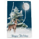 Hjort och uggla under vintern gräs träd med Glad helg och snötäcke över snöflingan. Himlar färg kan ändras. Text kan redigeras.