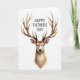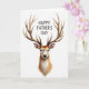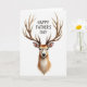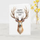 Denna design visar en hög hjort centrerad på en bred vit bakgrund, målad i mjuka tvättar som liknar akvarell. Dess huvud och nacke är vända framåt, med en mild, stadig blick som känns som en tyst band mellan förälder och barn 👨. Ovanför hornen sitter orden “HAPPY FATHER'S DAY” nära toppen i mörk bokstavsstil, jämnt fördelade och lätta att läsa. Pälsen är skuggad i varma bruna och krämiga höjdpunkter, blandade för att föreslå en mjuk, texturerad päls. Ljus rosa toner värmer de inre öronen, och små ljusa fläckar i ögonen ger ett ömt, uppmärksamt uttryck. Hornen reser sig i förgrenade kurvor och skapar en naturlig båge som inramar budskapet som skyddande armar. Subtil gråbr