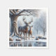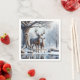 Buck och en doe står på ett skonsamt sätt bredvid en stillastående isig som omges av ett skogslandskap i vintras