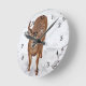 Foto av en hjortbock i vinter som står i snön med mer av falla för vitsaker. Denna är enpeka svart-tailed hjortbock, och han är tittar högert på kameran för hans porträtt.