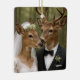 Ett hjortpar i bröllopskläder, med hjorthonan i en blomsterkrans och slöja och hjortbukken i kostym och fluga, står i en skog.