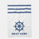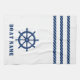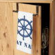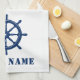 Anpassningsbar Nautical Fraktas Wheel Helm och Rope Rand med Personlig Boat Namn i Deep Navy Blue på ett Vita kökshanddukar.