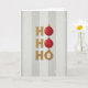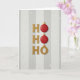 This card has a cool vertical layout that makes you think of Christmas right away. In big golden letters, it says "HO HO HO", but the 'O's are shiny red ornaments. Everything is neat and centered so your eyes go straight down the card. It feels fancy and happy, like a new version of holiday symbols but not too busy. The lighting is soft, making the gold shine and the red look soft and touchable.