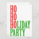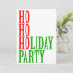 En roligt, djärv julfest inbjudan med ord "Ho Ho Helgdag" på framsidan. All händelseinformation finns på baksidan av kortet.