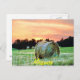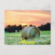 Hajbaler på rullande backe på landsbygden, avskurna framför en färgstark solnedgång