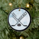 Låt oss dekorera Julgran med lite passion för hockey! Anpassa den här ishockeyprydnaden att erbjuda som gåva och dekorera ditt hus. Främre design: blå bakgrund + "God jul" + 2 Sticks och en puck i en svart cirkel Bakgrundsdesign: blå bakgrund + hockey-skridskor + personanpassa med hockeyspelarens eller fläkt namn - i en svart cirkel