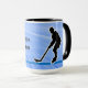 Om du gillar hockey (spelare eller fläkt) kommer du att njuta av att använda det här kvalitetskafnet mugg. En spelares silhuett har placerats på en konstnärlig blå bakgrund. Anpassa den med namn i bakgrunden. Texten ändras enkelt med hjälp av mallen. Om du vill göra andra ändringar (t.ex. teckensnitt, storlekt, färg eller placering) väljer du "Anpassa" och väljer "Redigera med Design Verktyg". Det finns även andra mugg stilar för denna utformning - kolla in alternativvalen.