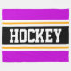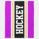 Den här sportiska, atletiska designen har fet HOCKEY-text inuti ett markerat svart rand med dubbla vit och gult tävla ränder mot ljusa yttre ränder för rosa av magenta. Texten i den här designen kan vara personlig.