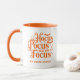 "Hocus pocus, jag vill att vin ska fokusera (eller ett starkt kaffe)" som står tryckt i orange på båda sidor om ett kaffe kopp, roligt för Halloween för kvinnor eller manar.