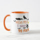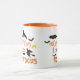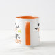 Lustigt Costum kaffe mugg för Halloween har en modern dekorativ orange och svart typografi med en häftig häxa och fladdermus runt.